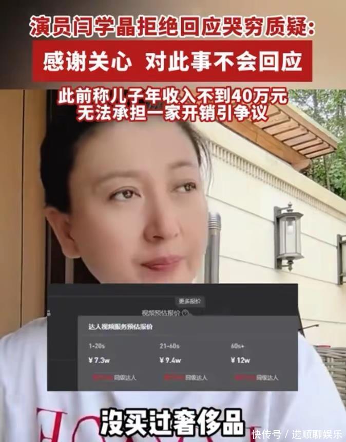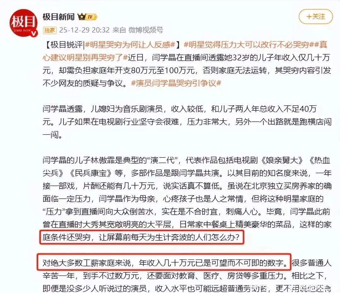 闫学晶这位之前名气以及口碑都还不错的女演员,最近这两天深陷争议。“哭穷”式“凡尔赛”让她一家人成为众矢之的。儿子儿媳一年收入40万,家庭每年花销百八十万,这些并不够,生活拮据,没买过奢侈品,觉得日子过得不太好。